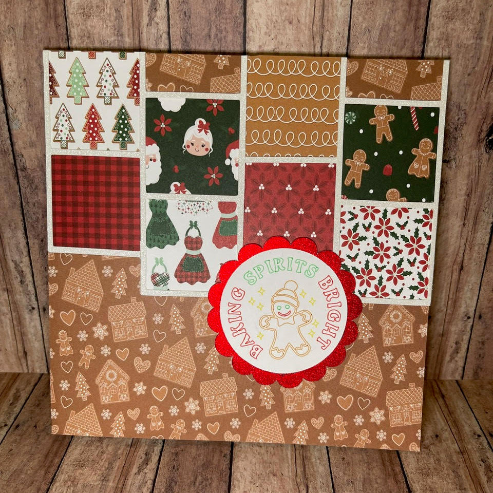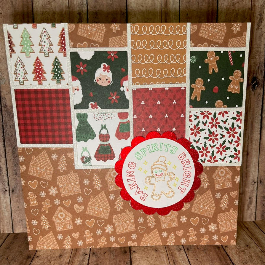 This unique and festive Christmas card is perfect for anyone who loves holiday baking and gingerbread cookies. Each card is meticulously handcrafted with a charming patchwork design featuring classic Christmas patterns like red plaid, gingerbread houses, and poinsettias. The centerpiece is a die-cut gingerbread man with the message "Baking Spirits Bright."