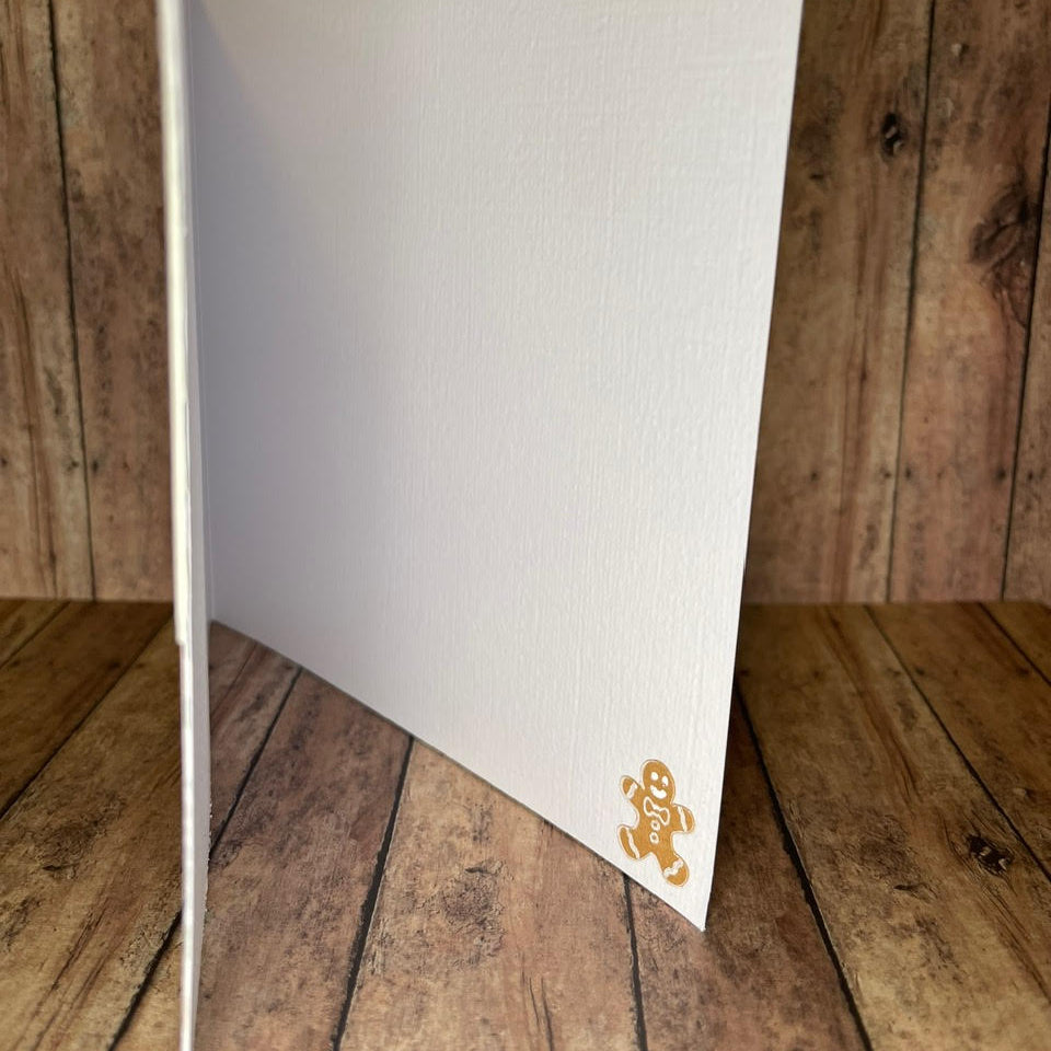 This high-quality handmade card has a small gingerbread man on the inside for an added touch and is blank, allowing you to personalize your message for any occasion.