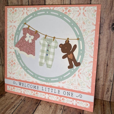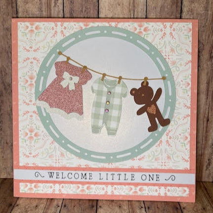 Celebrate the arrival of a precious little one with our delicately illustrated baby cards. This design features a charming clothesline adorned with a teddy, striped onesies, and a dainty pink dress, all set against a soft floral backdrop in blush and sage tones. The muted pink border an graceful "Welcome Little One" message add a timeless touch. This card brings warmth and whimsy to every new beginning.