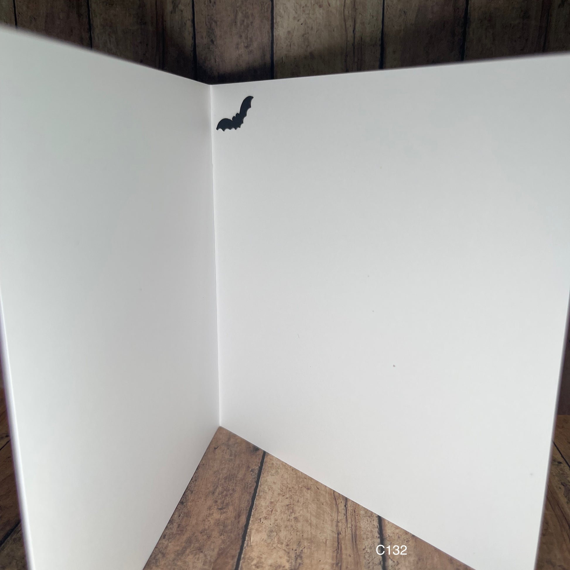 Spooky "Trick or Treat" Cauldron handmade card with jack-o-lantern faces in the background and bats flying around. That makes the perfect Halloween card. This high-quality card has a small bat on the inside for an added touch and is blank, allowing you to personalize your message for the occasion.