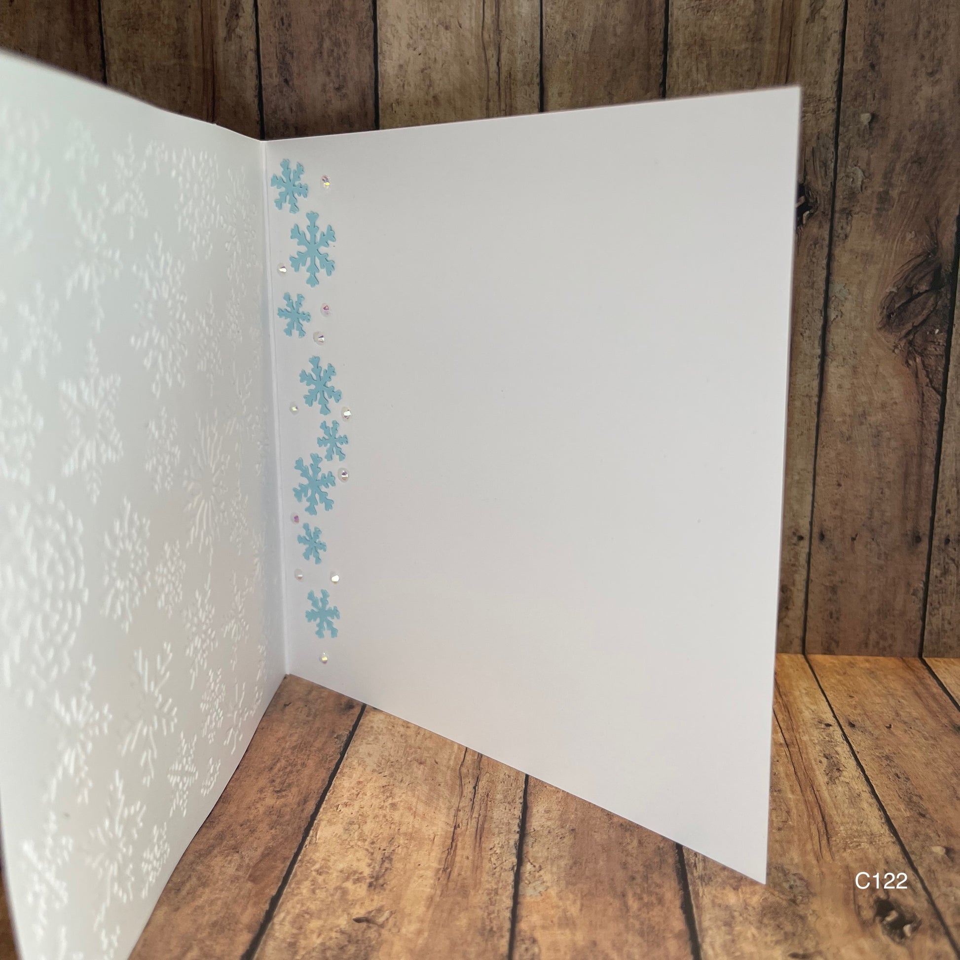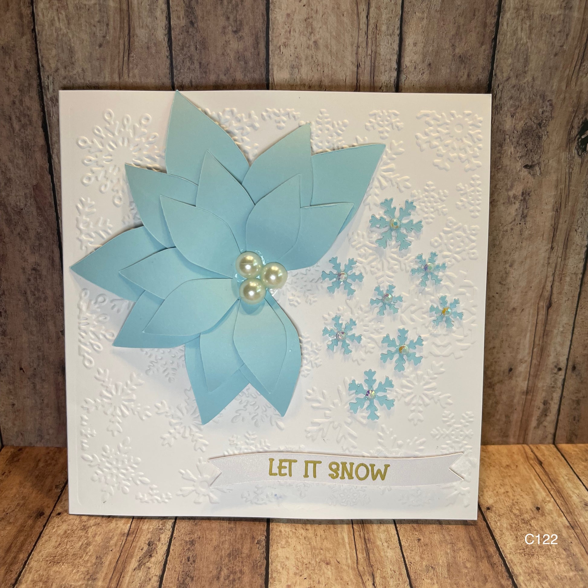 The soft blue poinsettia that blows away into snowflakes almost make you hope for snow! This handmade card can be used for so many occasions like a birthday, thank you, thinking of you, kindness, friendship, etc. The possibilities are endless. This high-quality card has small snowflakes on the inside for an added touch and is blank, allowing you to personalize your message for the occasion.