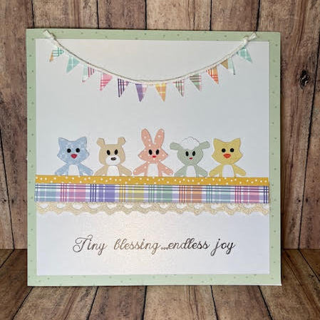 Celebrate the joy of a new arrival with this cheerful handmade card. A playful row of pastel animals sits beneath a colorful bunting banner, while plaid and polka dot accents add a charming, whimsical touch. Finished with delicate lace trim and the heartfelt sentiment "Tiny Blessing...endless joy", this card is perfect for baby showers, newborn celebrations, or simply sharing love with proud new parents.