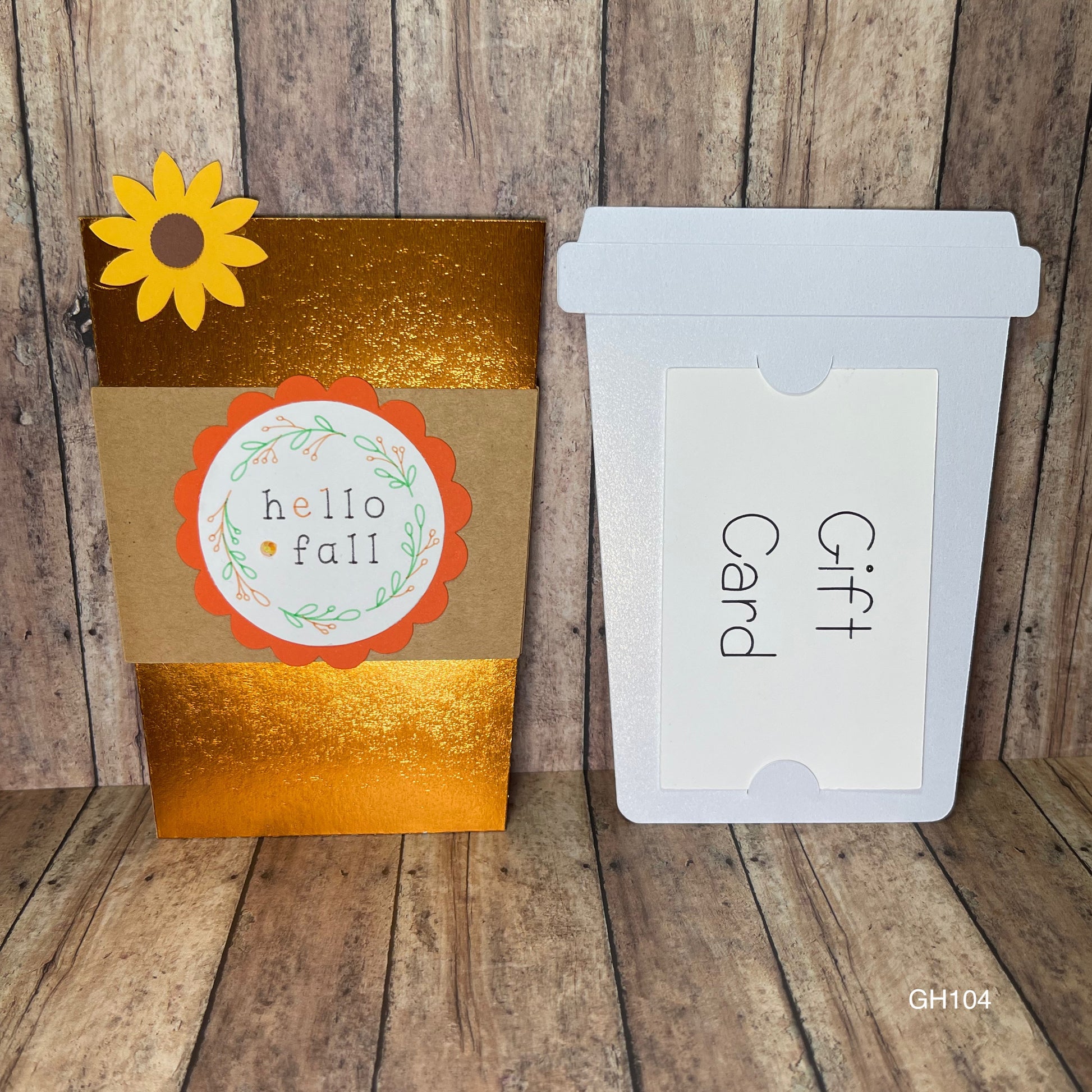 This coffee cup gift card holder is the perfect gift for all things Fall. The card is shaped like a coffee cup and features the words “Hello Fall” on the front. The inside pulls up from the top so you can add your gift card. On the back of the cup is a “To/From” label and comes with a white envelope. Packaged in a cellophane sleeve. Measures 3.75" x 5.5625". Made of premium cardstock.