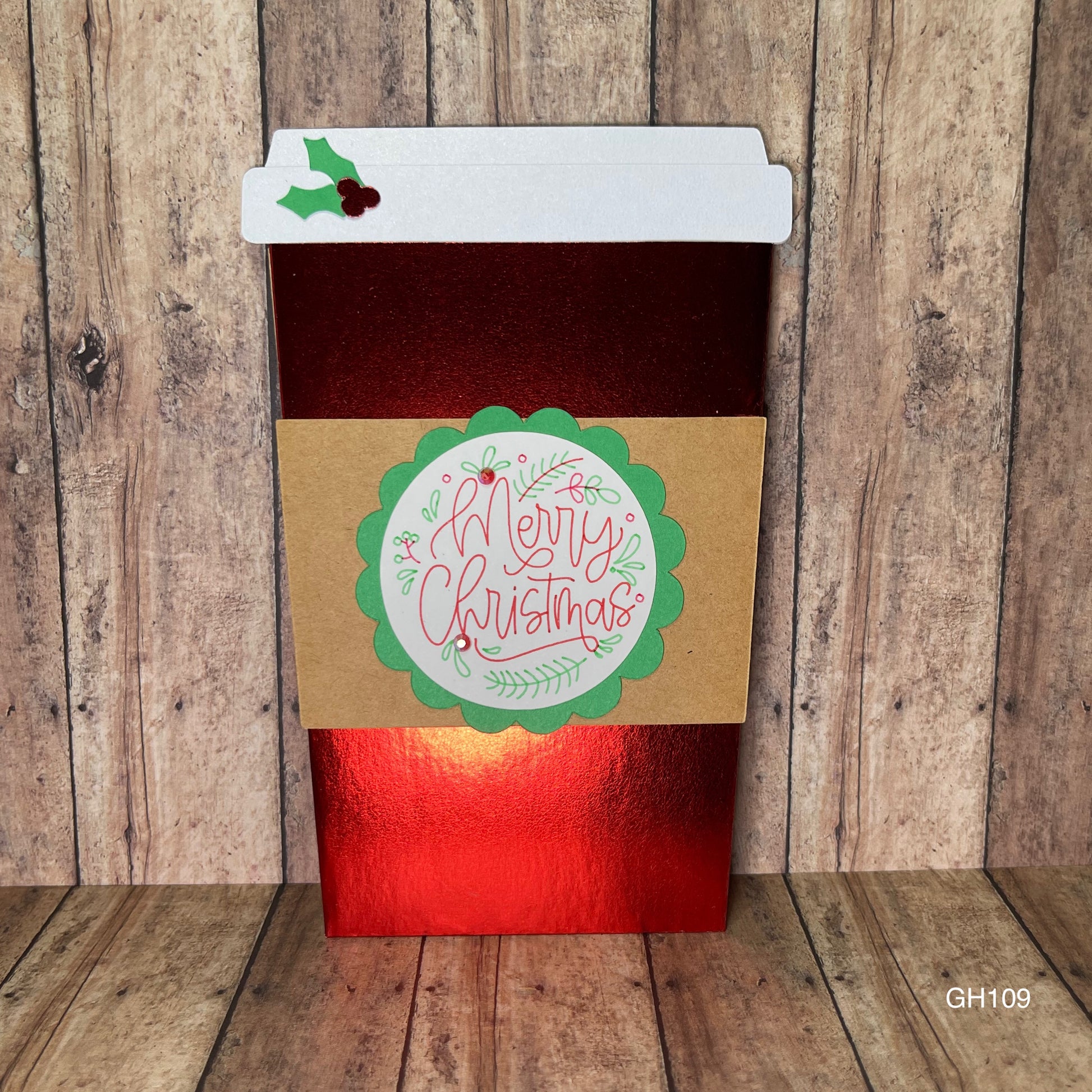 This coffee cup gift card holder is the perfect gift for the holiday season. The card is shaped like a coffee cup and features a Merry Christmas sign on the front. The inside pulls up from the top so you can add your gift card. On the back of the cup is a “To/From” label and comes with a white envelope. Packaged in a cellophane sleeve. Measures 3.75" x 5.5625". Made of premium cardstock.