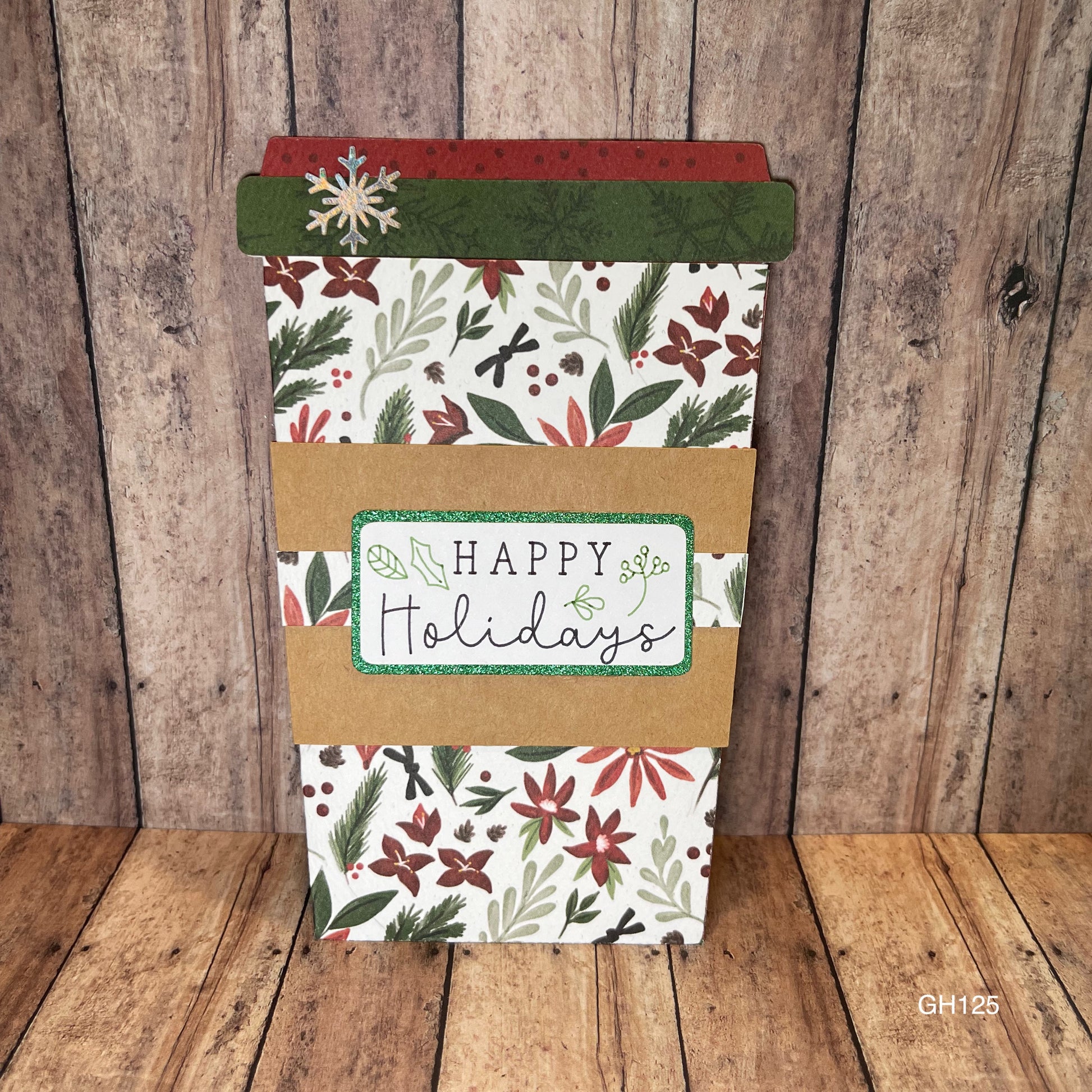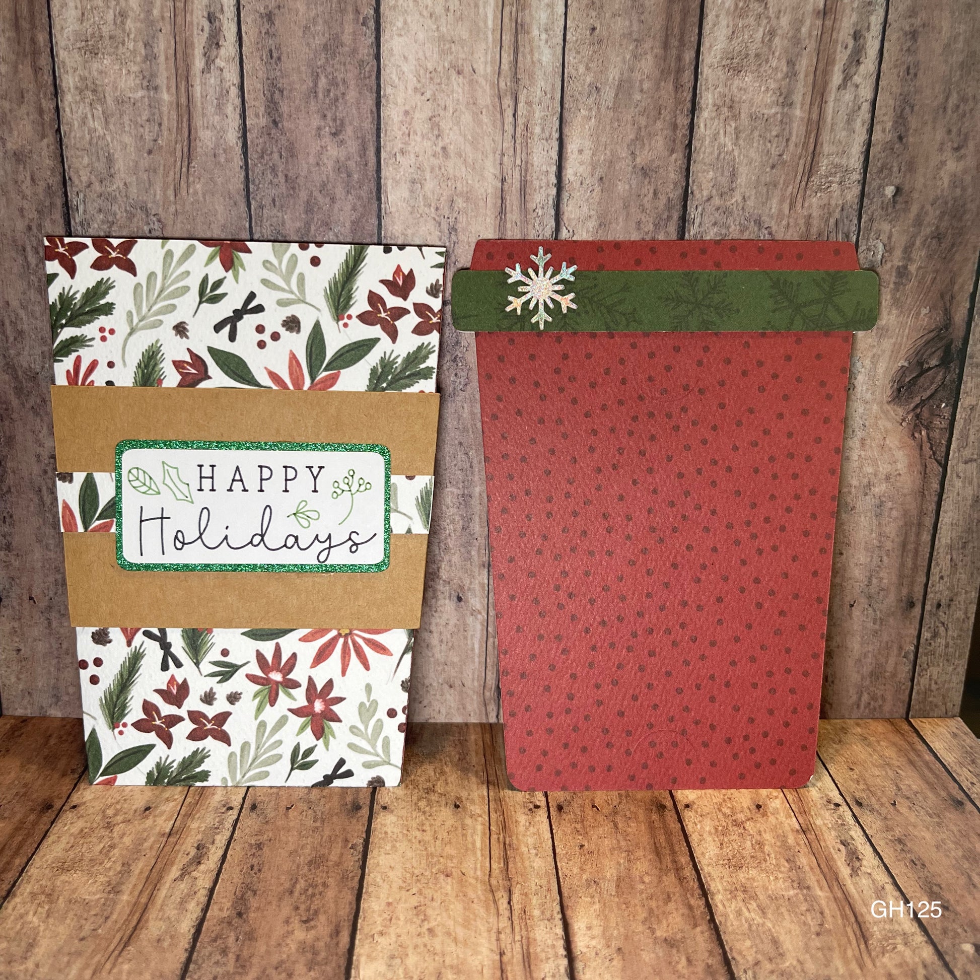 This coffee cup gift card holder is the perfect gift for the holiday season. The card is shaped like a coffee cup and features a Happy Holiday embellishment on the front. The inside pulls up from the top so you can add your gift card. On the back of the cup is a “To/From” label and comes with a white envelope. Packaged in a cellophane sleeve. Measures 3.75" x 5.5625". Made of premium cardstock.