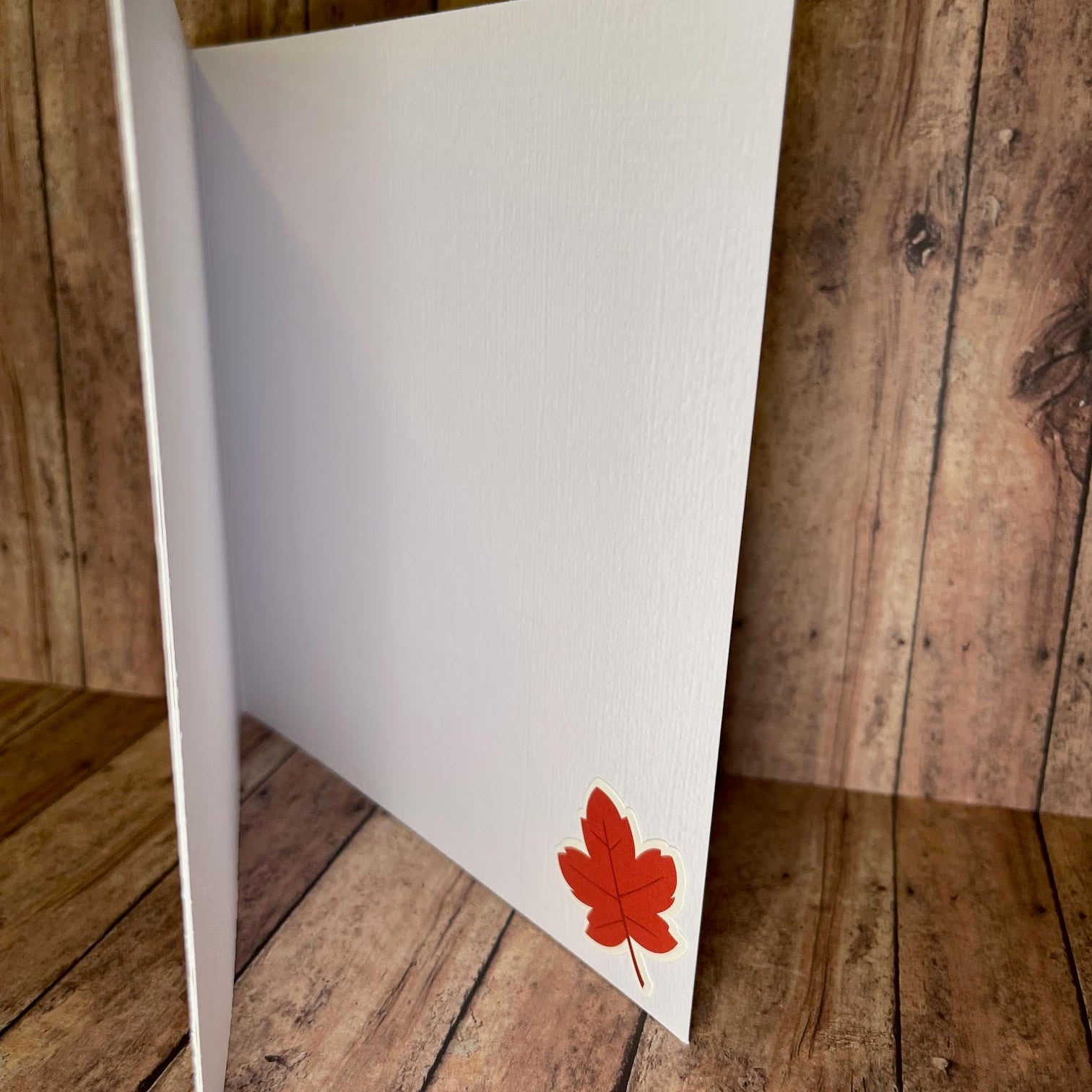 This high-quality handmade card has a small leaf on the inside for an added touch and is blank, allowing you to personalize your message for any occasion.