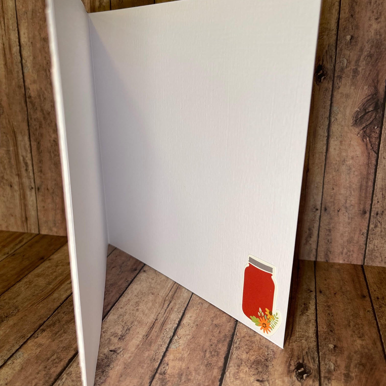 This high-quality handmade card has a small mason jar on the inside for an added touch and is blank, allowing you to personalize your message for any occasion.