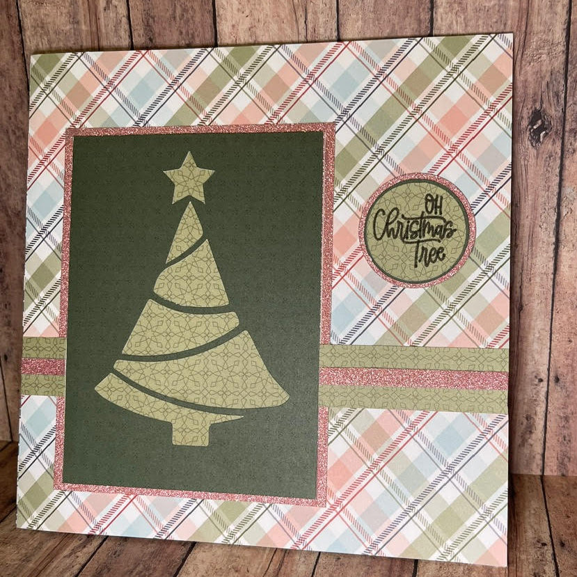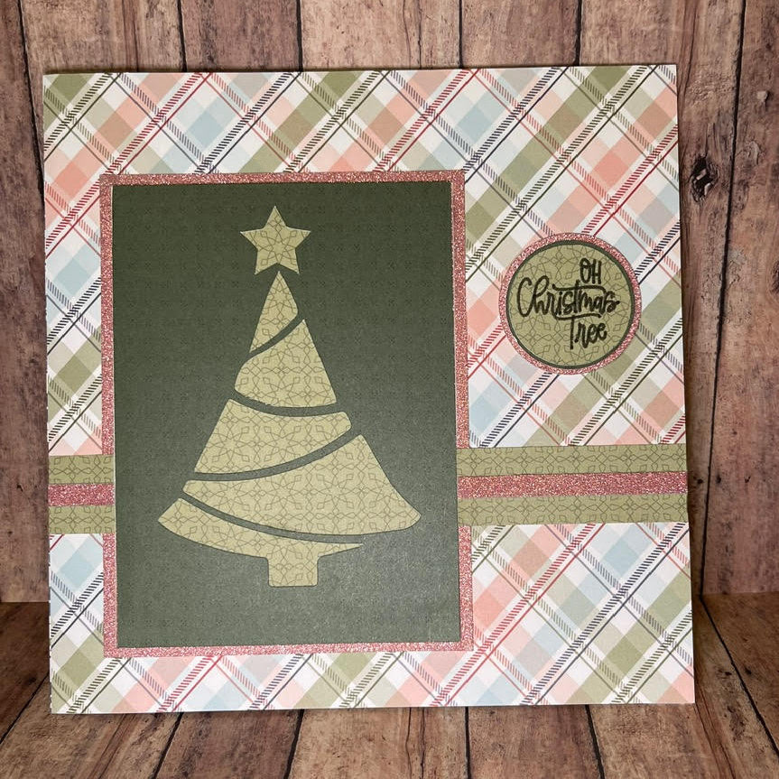 Share holiday cheer with this beautifully handcrafted greeting card. The design features a classic plaid background in soft pastel colors, creating a cozy and rustic feel. A Christmas tree, detailed with a subtle pattern and topped with a glittery star, is the focal point on a dark green panel. The card is finished with a charming "Oh Christmas Tree" sentiment, making it a unique and heartfelt way to send your season's greetings.