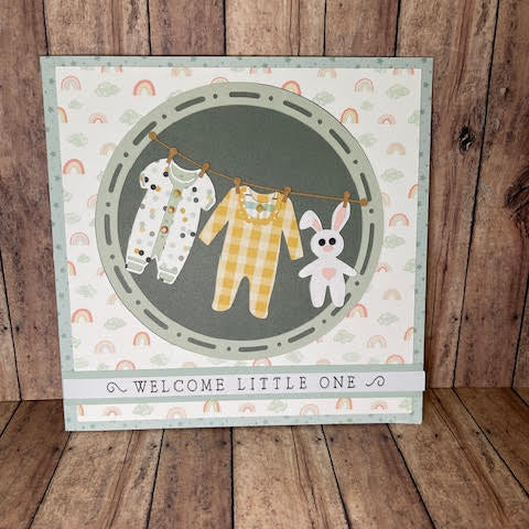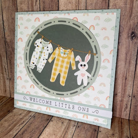 Our charming baby greeting card is designed to capture the joy of new life. Featuring soft pastel rainbows, twinkling stars, and a whimsical clothesline with cozy onesies and a cuddly bunny, the card radiates warmth and love. Whether you're welcoming a newborn or sending heartfelt wishes to new parents, our design offers a sweet and timeless way to celebrate.