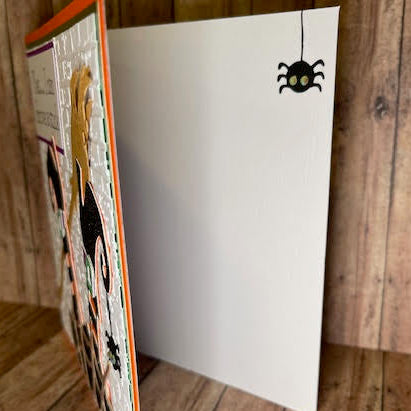 This high-quality handmade card has a small dangling spider on the inside for an added touch and is blank, allowing you to personalize your message for any occasion.