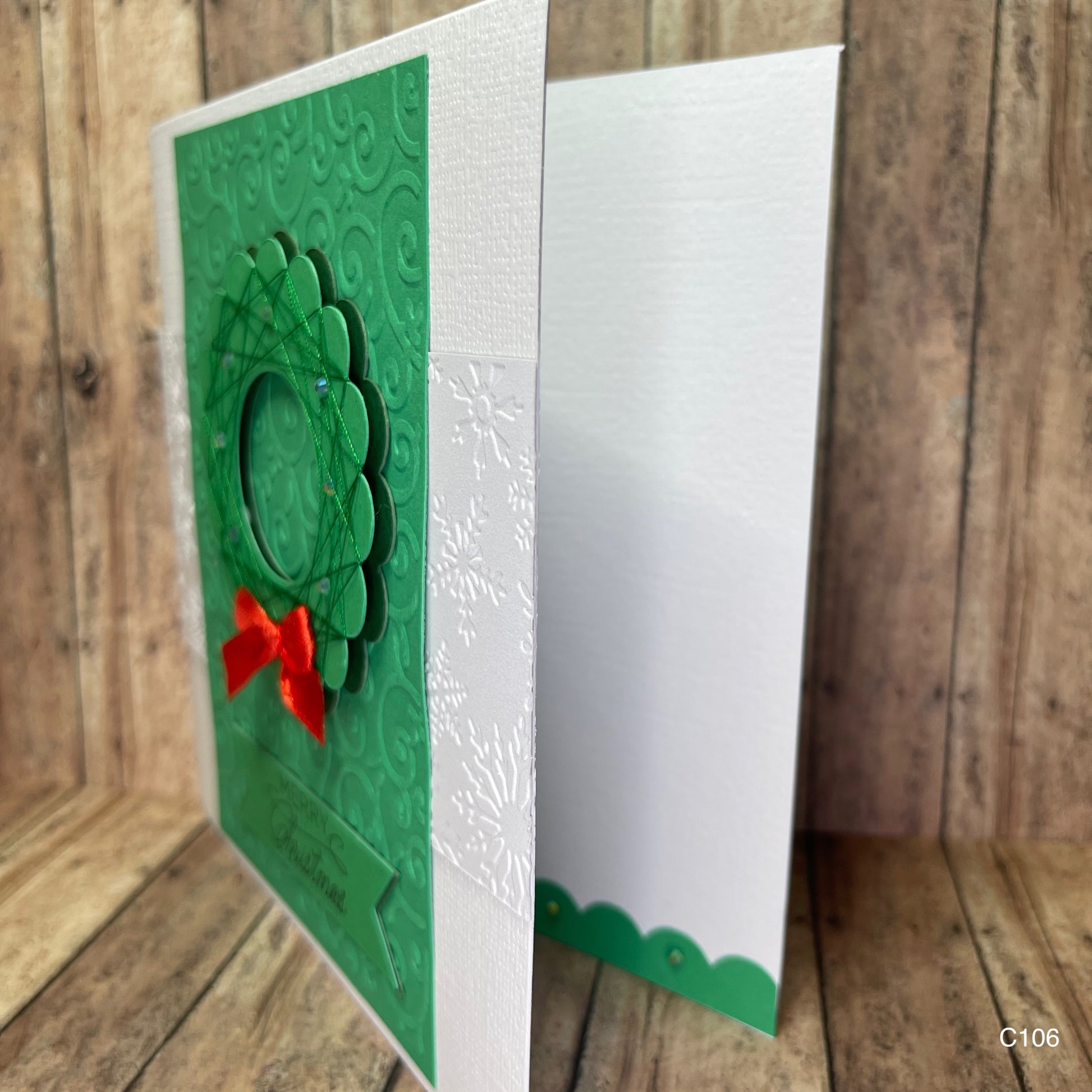 Spread some holiday cheer with this beautifully embossed string wreath greeting card. Adorned with a red bow and a Merry Christmas banner. This high-quality card has a small border on the inside for an added touch and is blank, allowing you to personalize your message for the occasion.