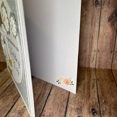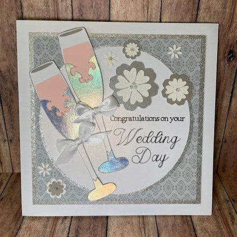 Celebrate love in timeless style with this handcrafted wedding card. Featuring two shimmering champagne flutes, delicate floral accents, and a white satin bow., it's the perfect way to toast the happy couple. The soft silver and gray palette with holographic sparkle adds an elegant touch, making this card a keepsake they'll treasure long after the wedding day.