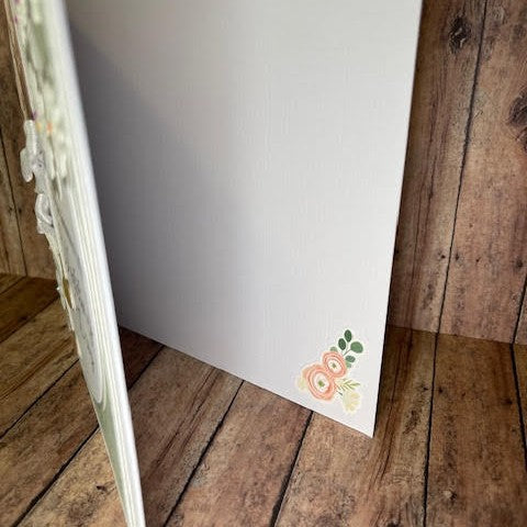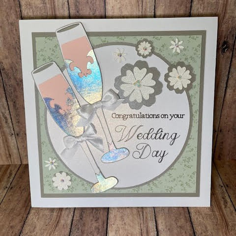 Celebrate their special day with this elegant handmade wedding card. Featuring two shimmering champagne flutes, delicate layered flowers, and a stain bow, it's a beautiful way to toast the happy couple. The soft sage green background with subtle floral pattern adds a fresh, romantic touch, while holographic accents make the card sparkle. A keepsake they'll treasure long after the wedding day.