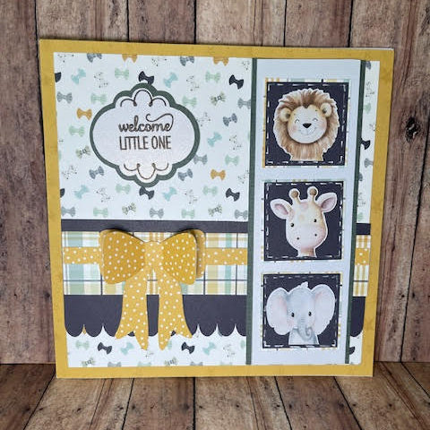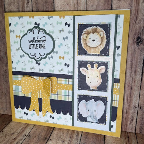 Celebrate the arrival of a little explorer with this cheerful handmade card, bursting with color and charm. Featuring a trio of lovable baby animals - a lion, giraffe, and elephant. Framed in playful square panels, this design is perfect for welcoming a newborn with a smile. The mix of polka dots, plaid, and bow tie patterns adds a whimsical touch, while the oversized yellow bow and scalloped accents bring texture and flair. Finished with a cloud shaped "welcome little one", this card is ideal for baby showers, nursery decor, or heartfelt gifts.